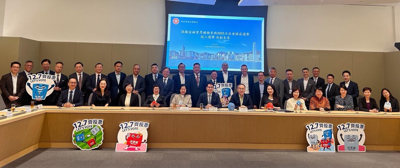 2025年11月14日,香港特区政府财经事务及库务局(“财库局”)邀请逾30家Financial Services Network成员、行业协会及金融机构代表会面,就推动12月7日立法会换届选举投票工作的进展作深入交流,并呼吁业界踊跃参与,共同为香港的未来出一分力。协会副总裁傅剑代表出席会议。
