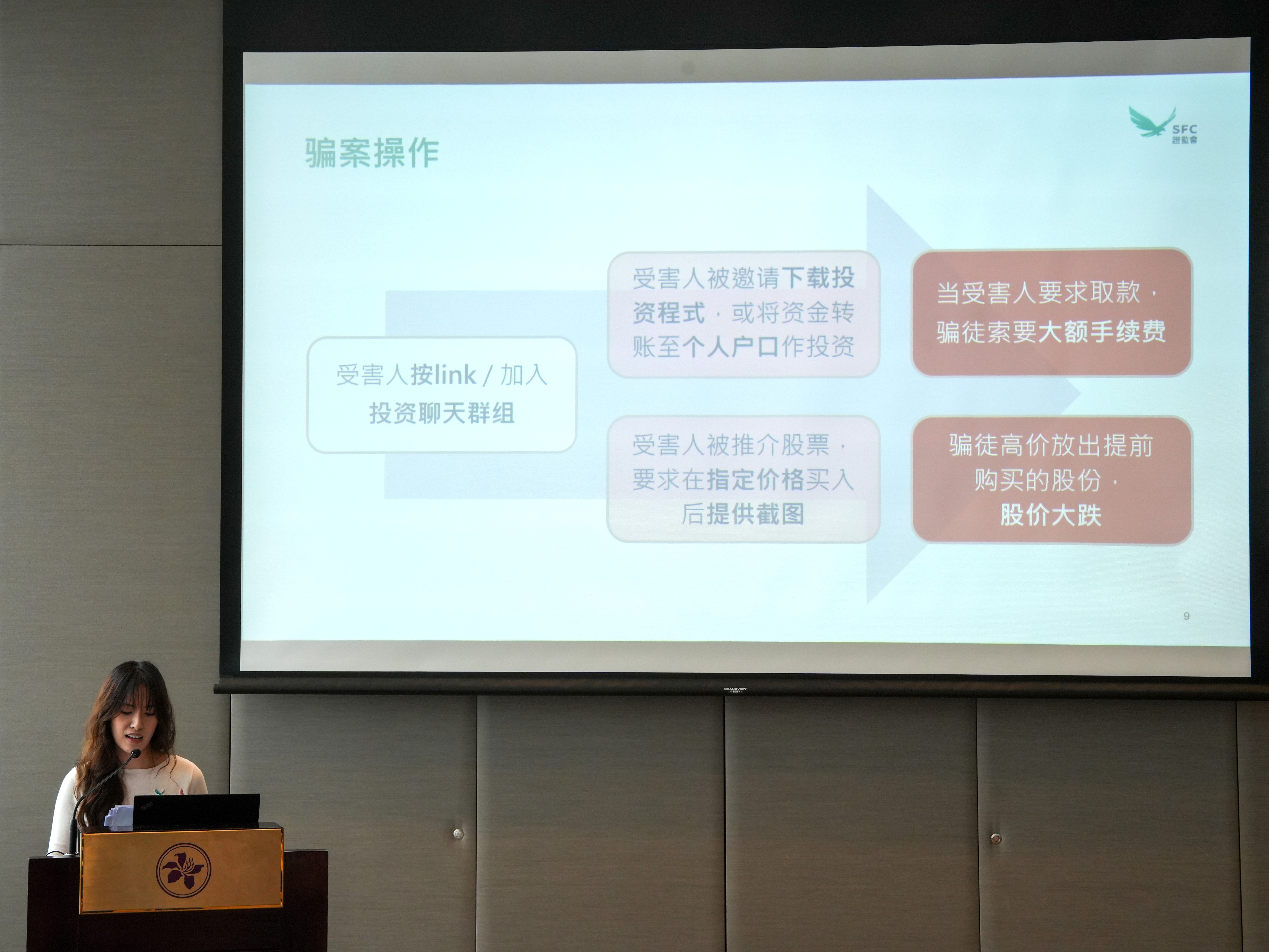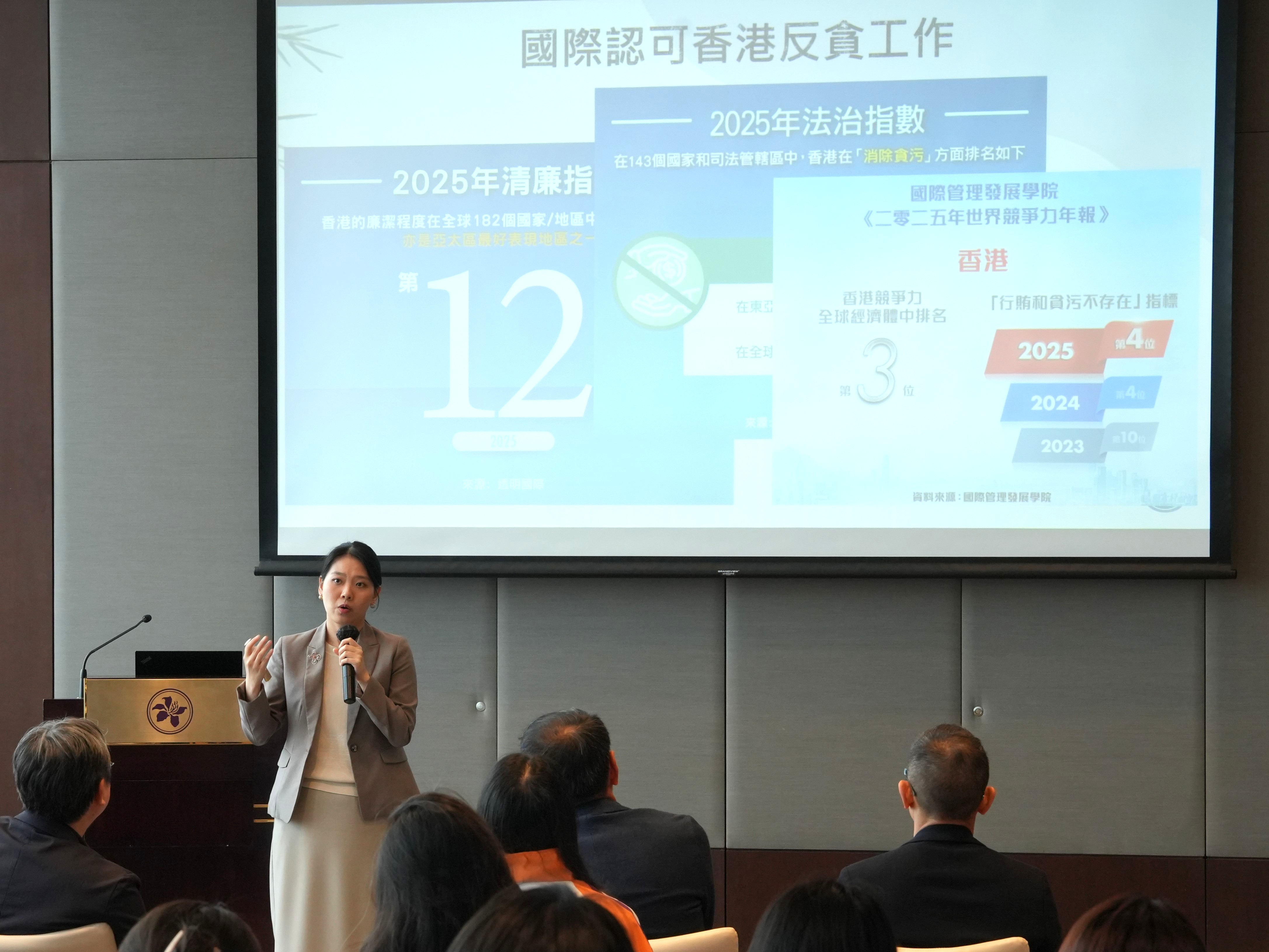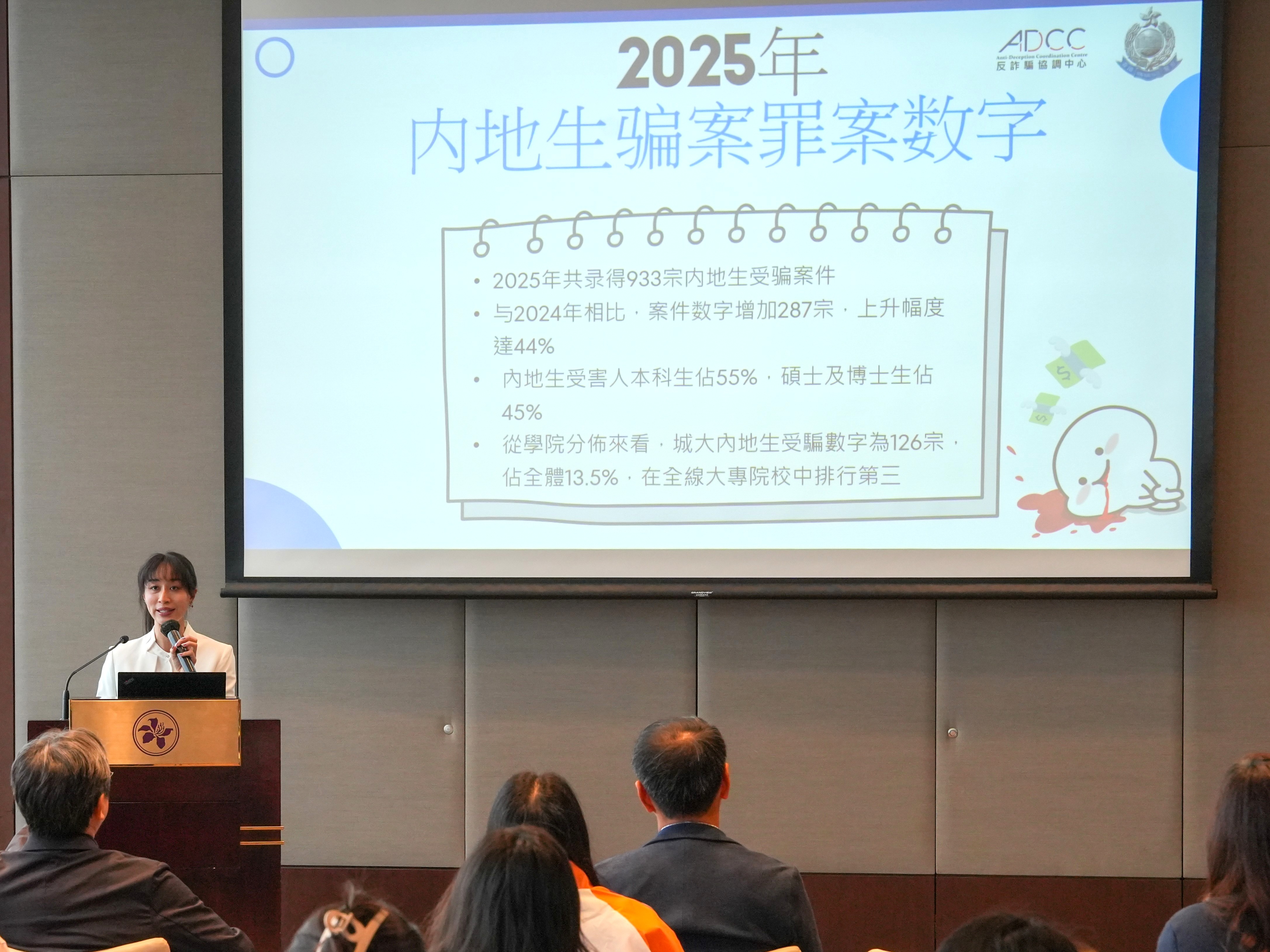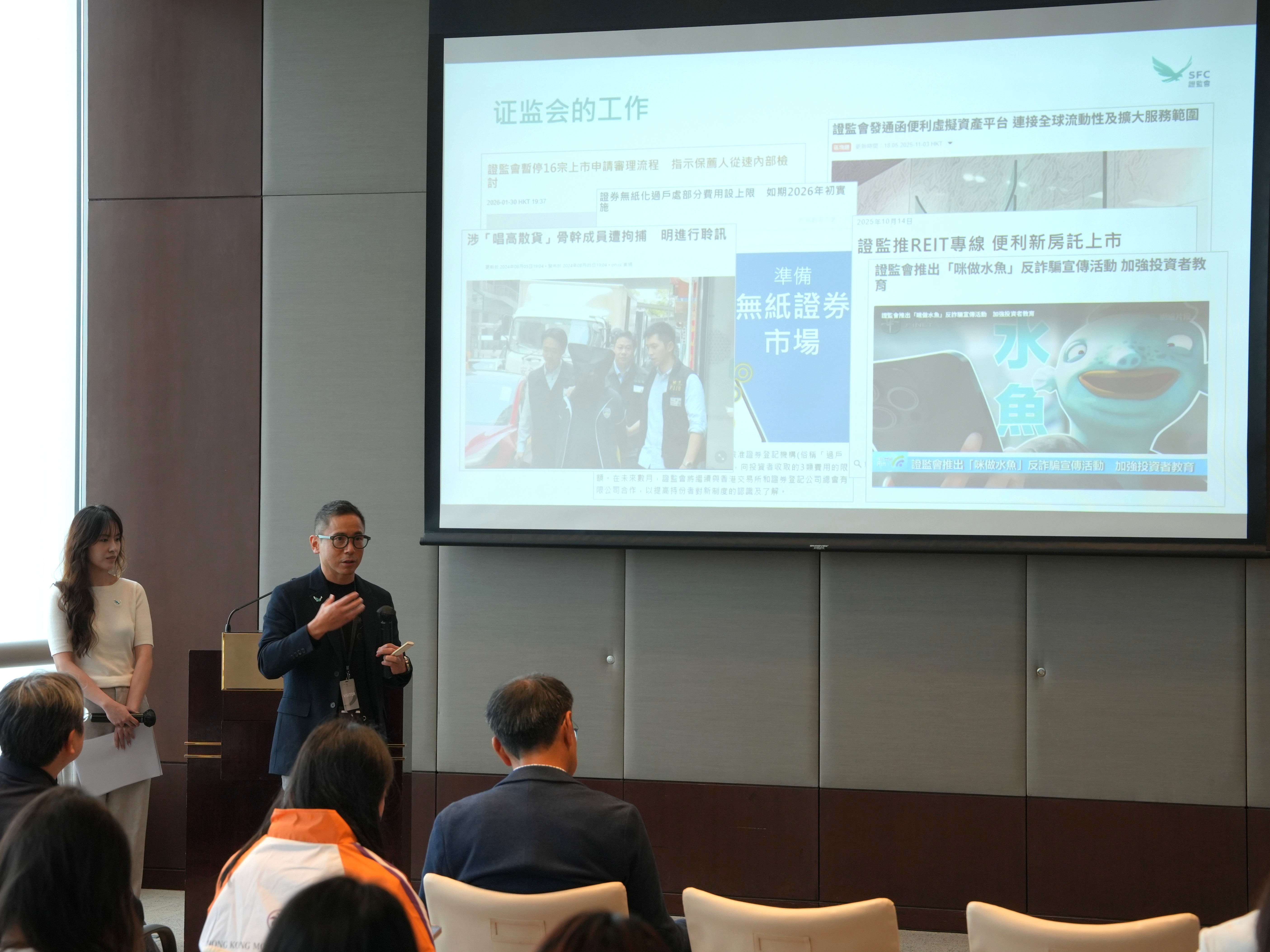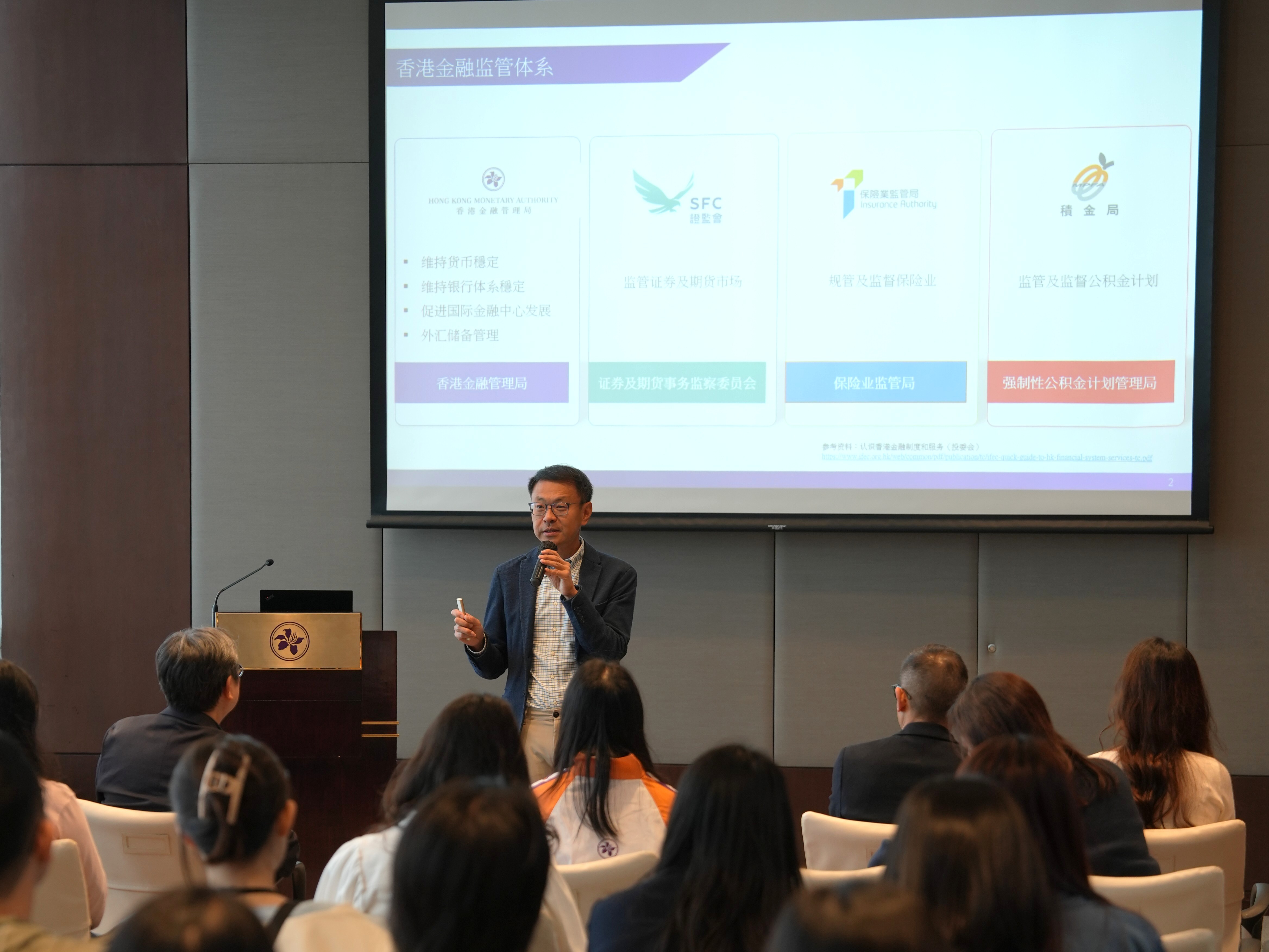 活动由协会副总裁陈永德及傅剑主持并致欢迎辞。随后,多位监管机构代表与学生深度交流:金管局助理总裁(法规及打击清洗黑钱)陈景宏从全球宏观金融背景切入,介绍了金管局监管架构、欺诈案例和防骗措施;ADCC高级督察洪琦琦从专业角度分享诈骗手法和防骗技巧,并透过互动抢答游戏带动全场气氛,决胜出3位优胜者;证监会秘书长兼首席管治总监杨国梁,以及机构秘书及对外事务助理经理王弘月详细介绍了证监会的职能与投委会的运作;最后ICAC高级廉政教育主任刘秀敏对廉政公署工作内容做了简单介绍,让学生学会识别冒廉人员技巧。