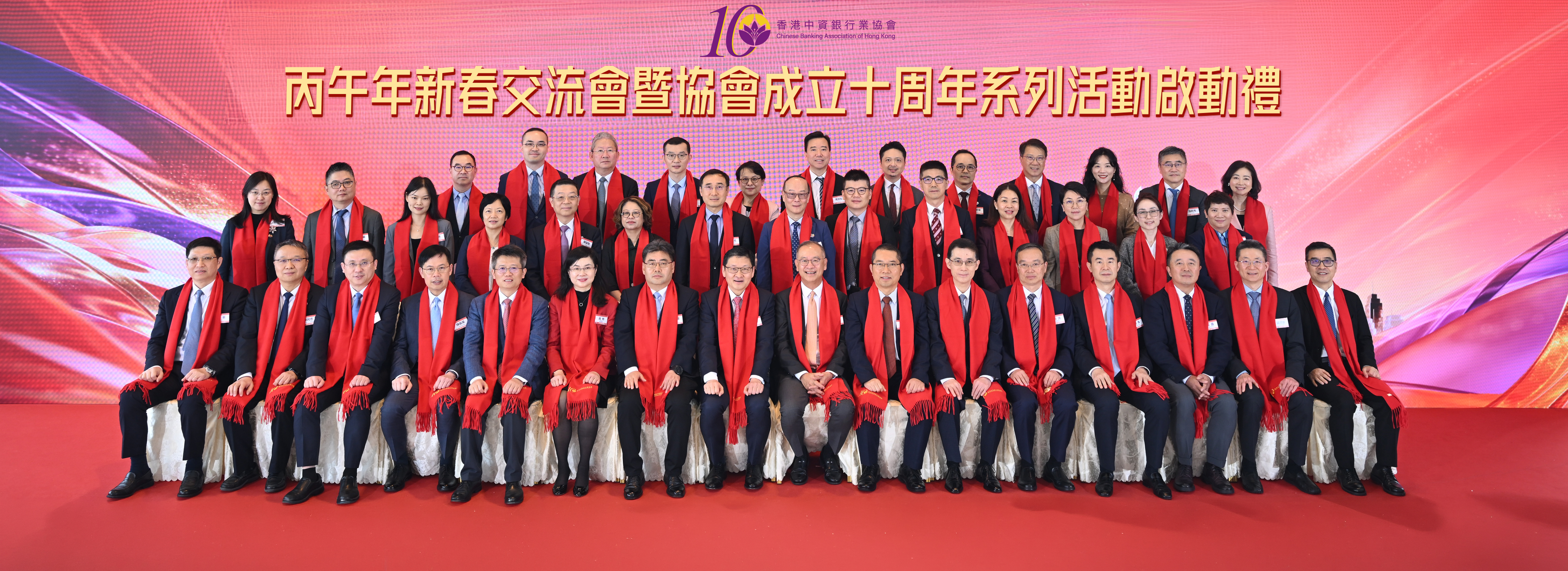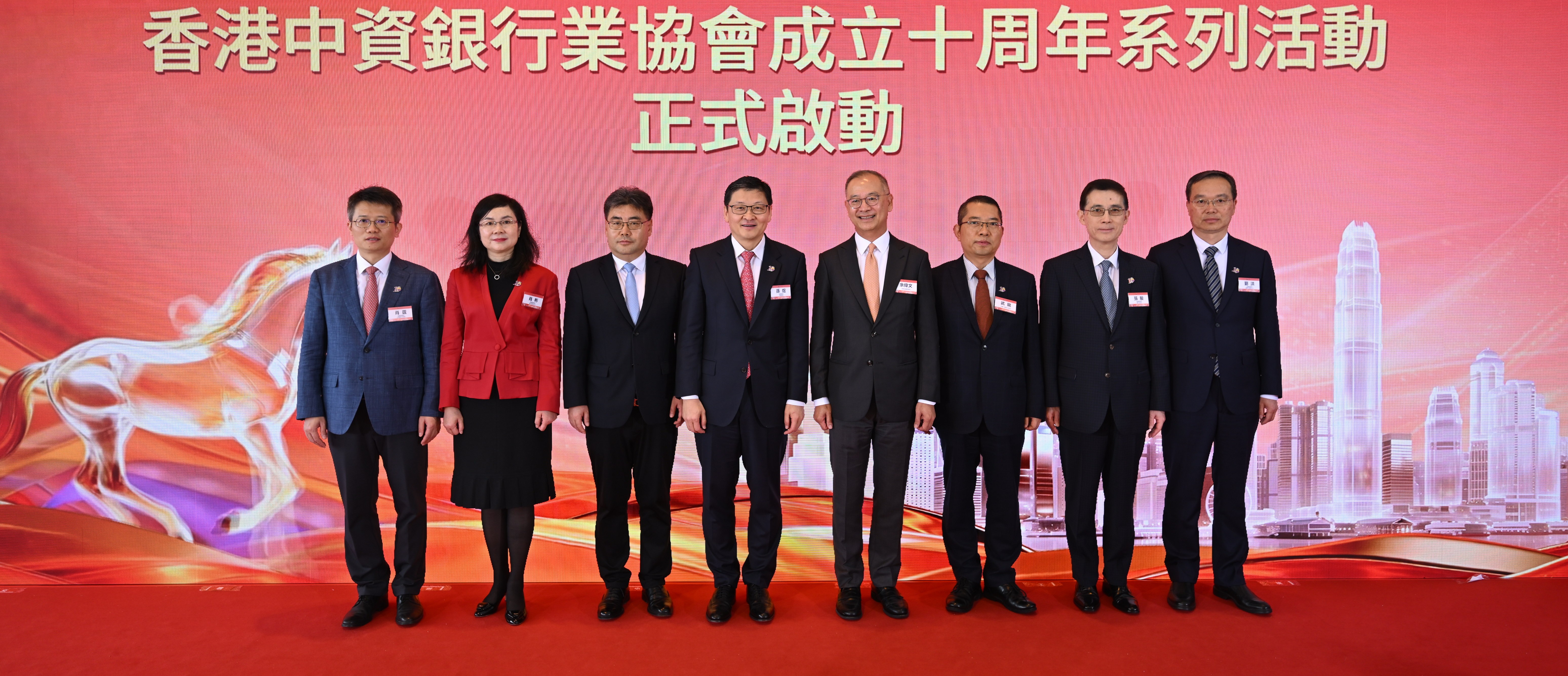 同心並進十載,聚力躍馬新程。2026年2月27日中午,中銀大廈70樓人頭攢動,熱鬧非凡,協會丙午年新春交流會暨協會成立十周年系列活動啟動禮在此隆重舉行。香港金融管理局(「金管局」)總裁余偉文、中聯辦經濟部部長徐衛剛、協會會長、副會長,協會會員單位代表等逾40人參加了交流會。