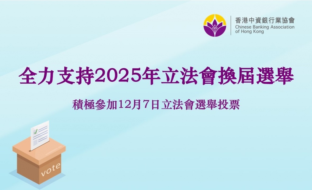 香港中資銀行業協會全力支持2025年立法會換屆選舉 2025年立法會換屆選舉將於12月7日舉行。香港中資銀行業協會呼籲會員單位團體選民,以及會員單位員工與家人朋友,積極參加12月7日立法會選舉投票,選出愛國愛港、有擔當、有能力的代表,共創更美好未來,一同為香港繁榮穩定努力。