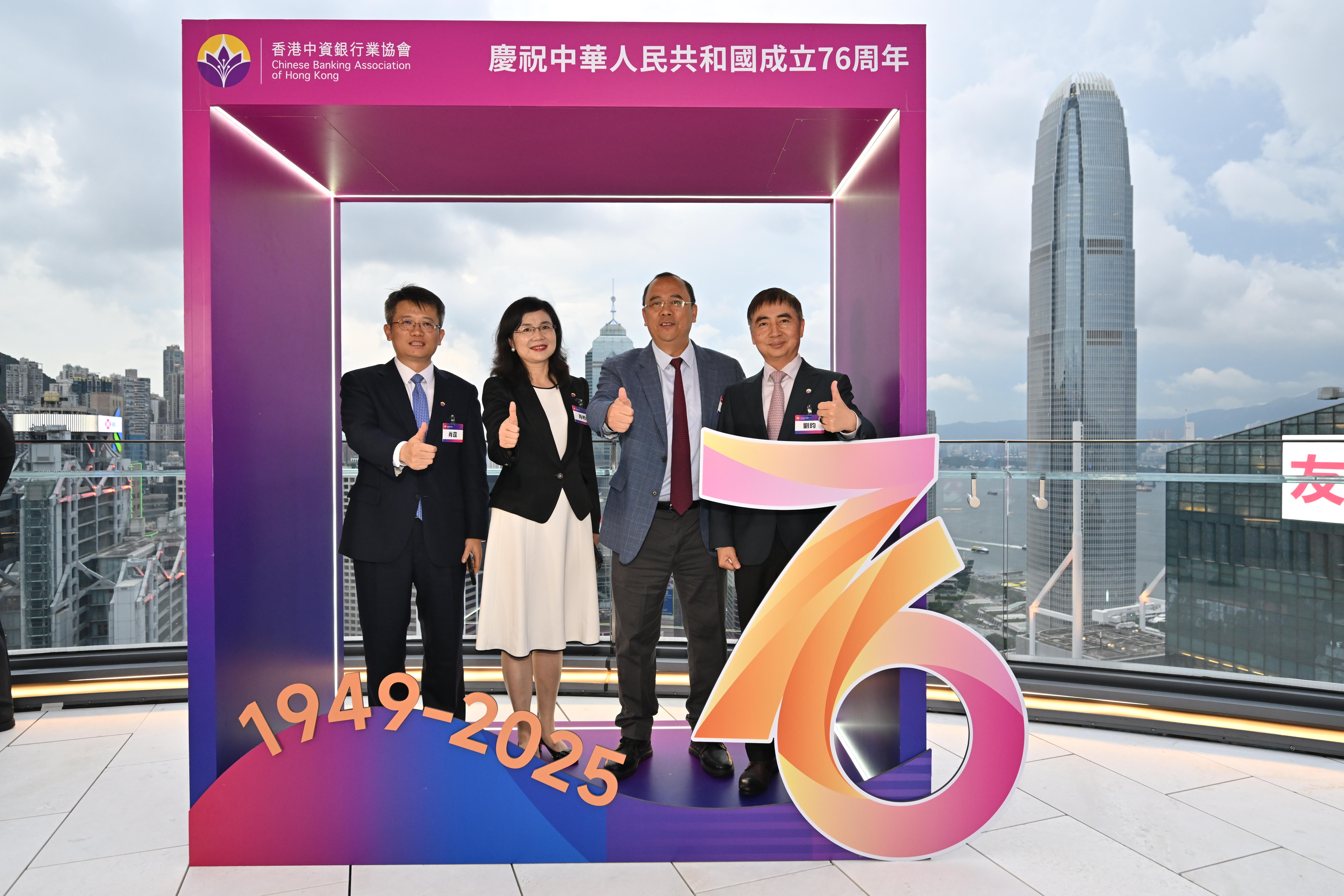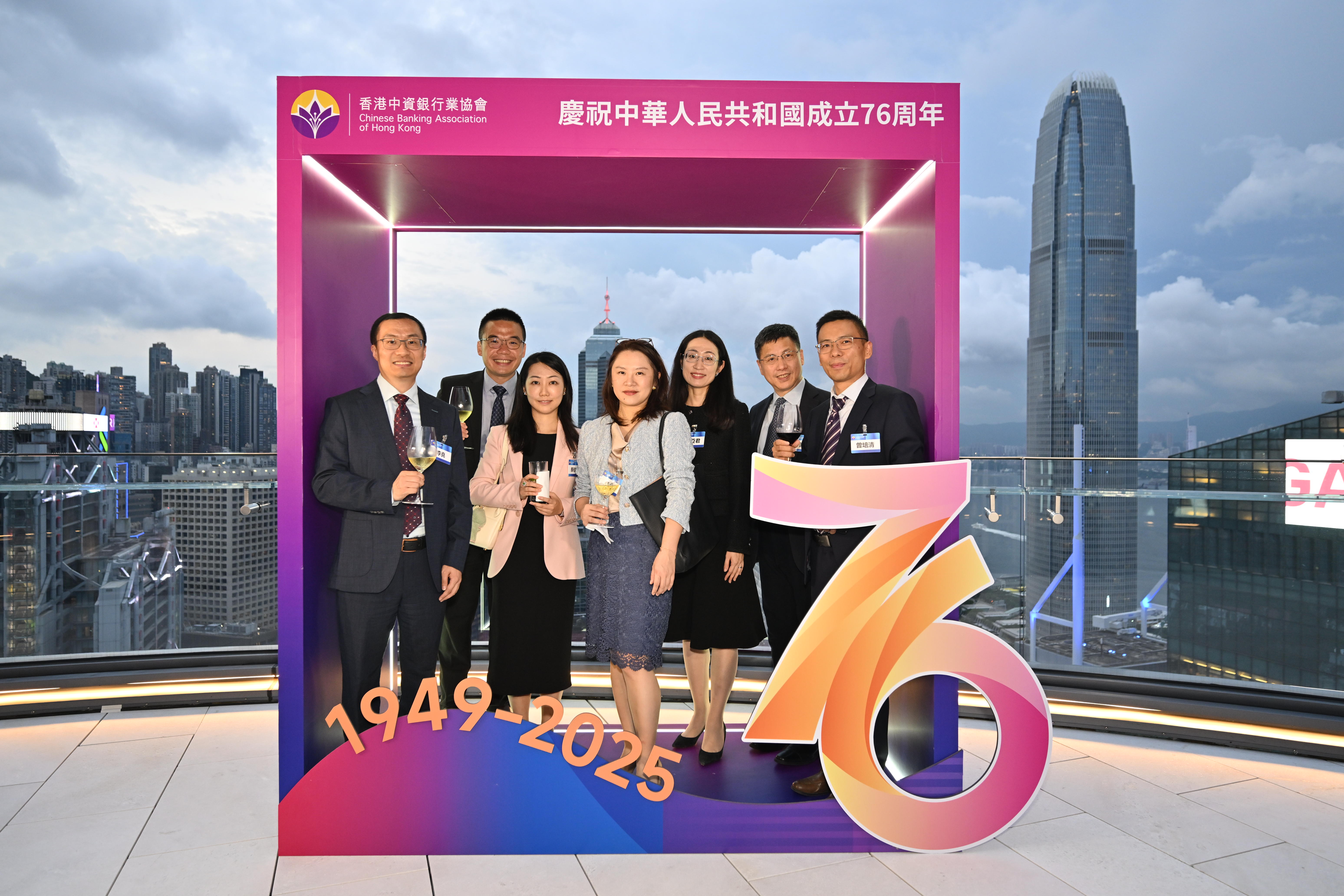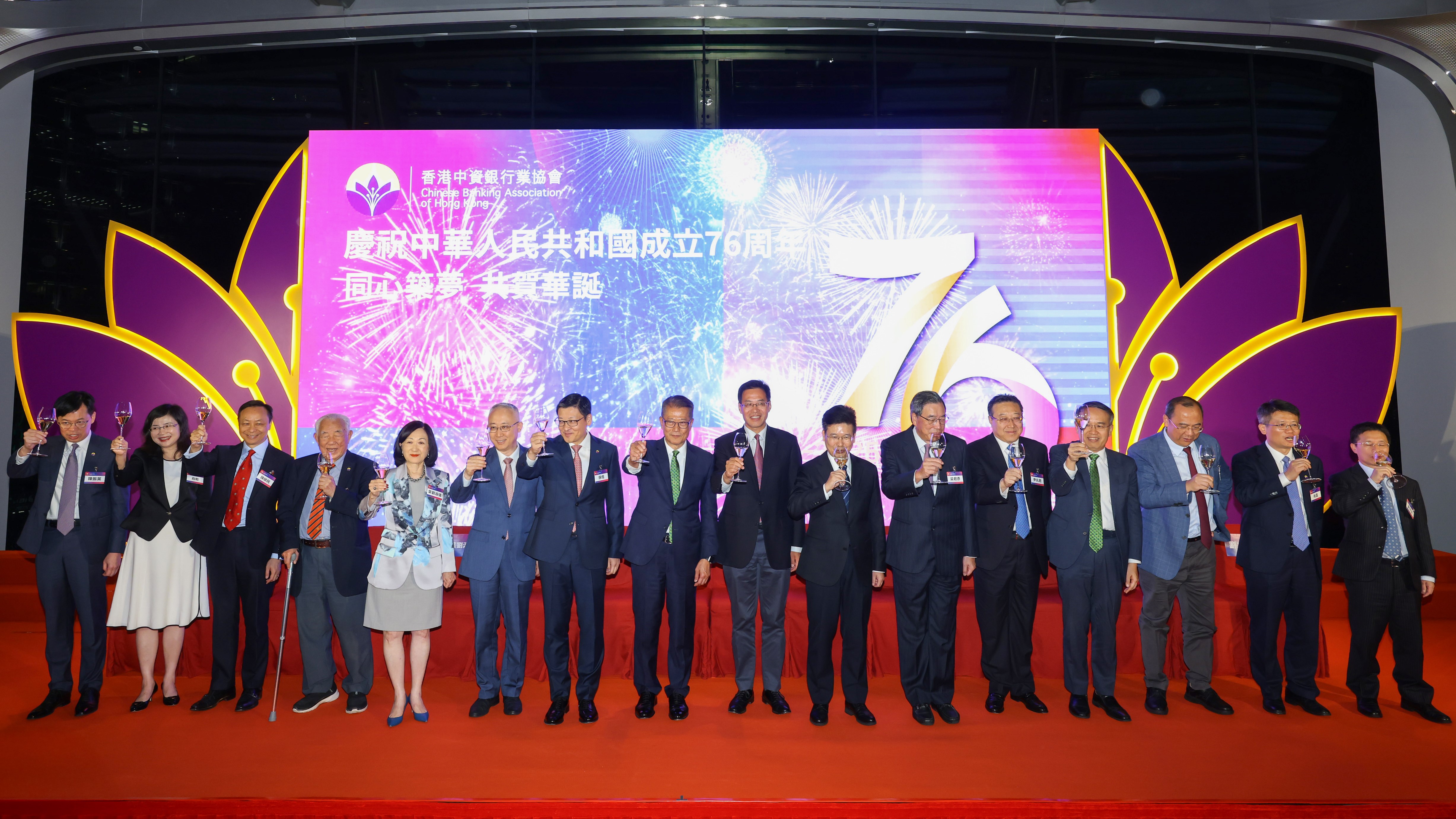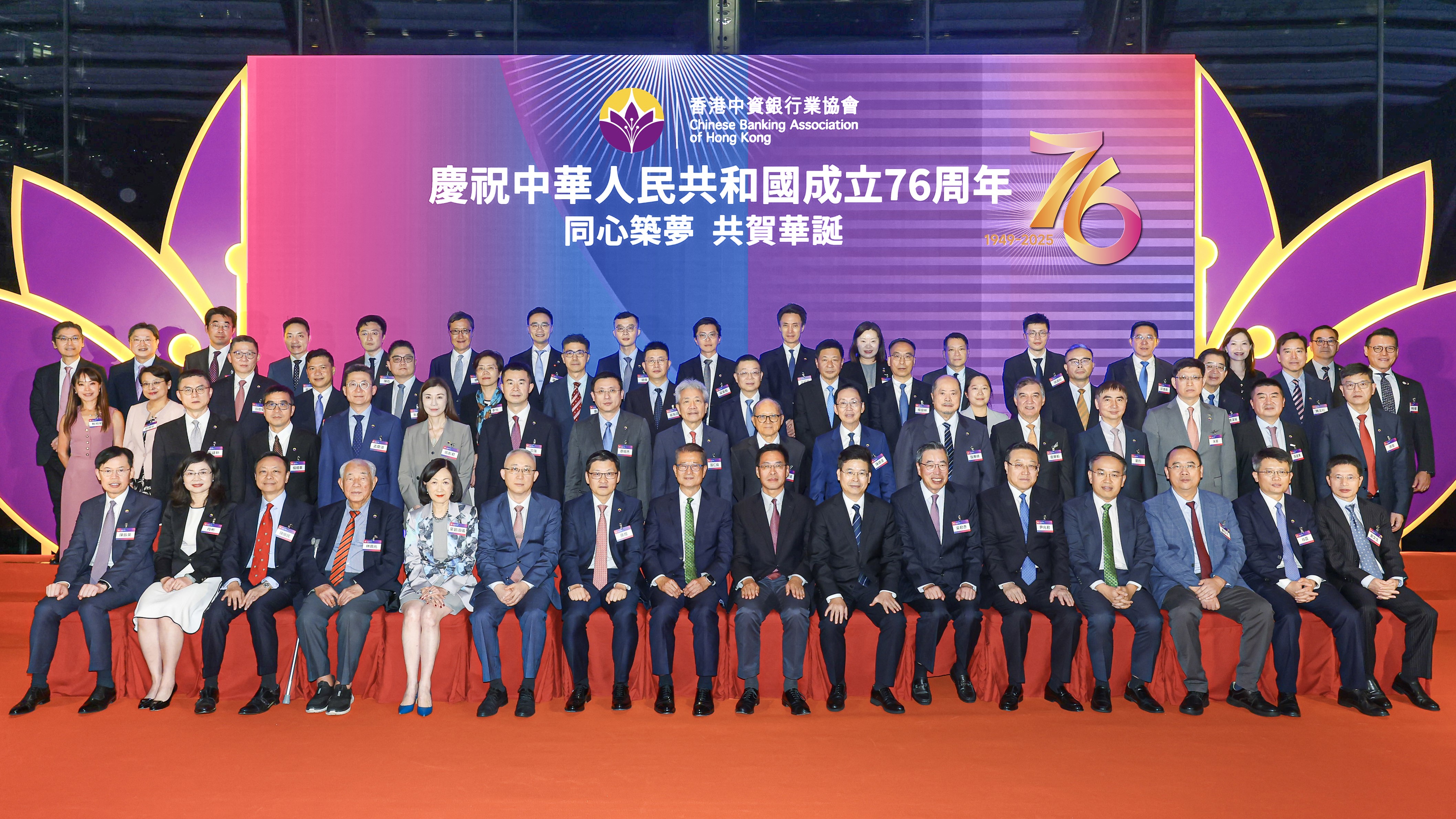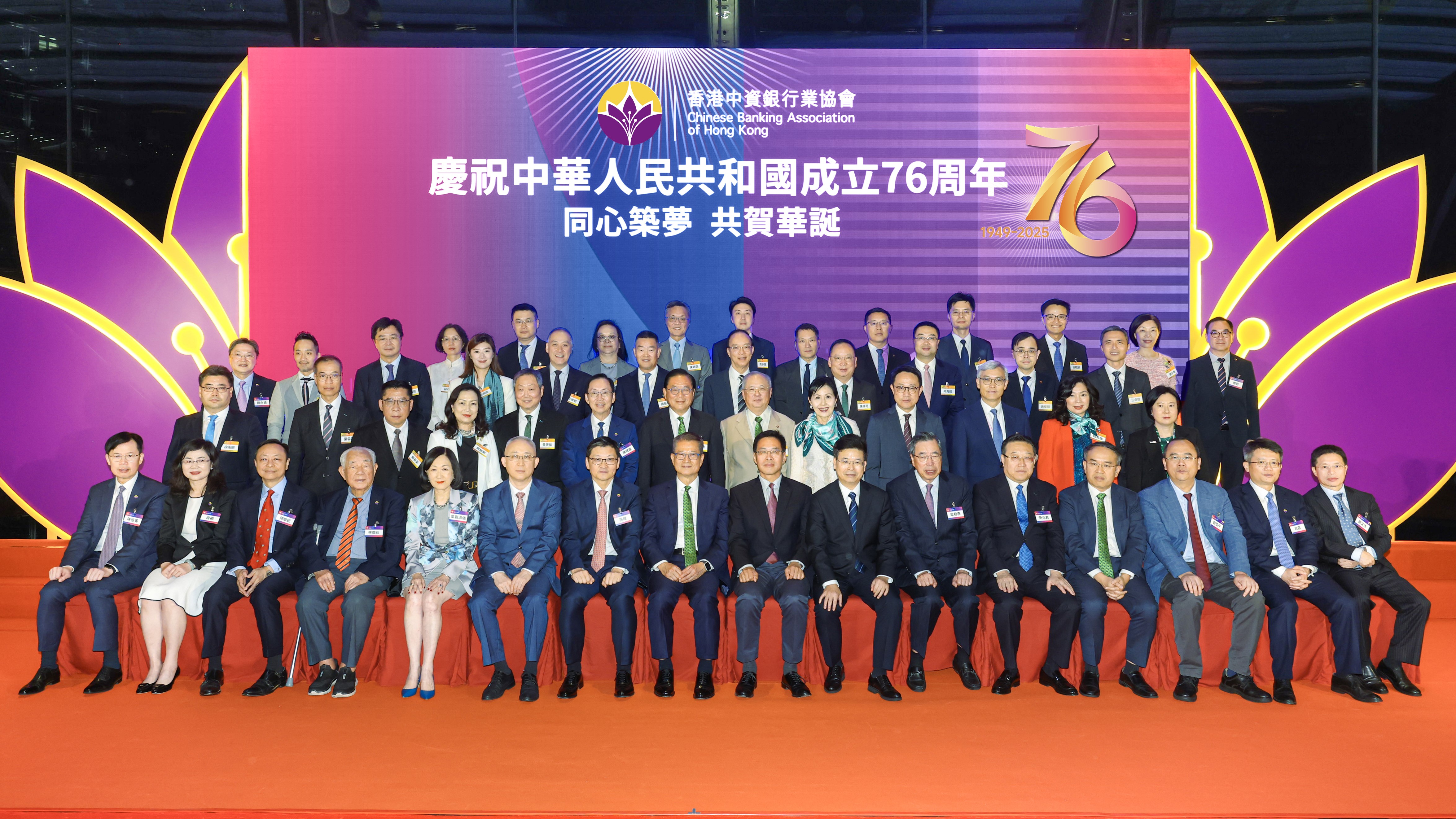 2025年9月17日,香港中資銀行業協會(「協會」)假香港The Henderson宴會廳舉行慶祝中華人民共和國成立76周年酒會。香港特別行政區政府財政司司長陳茂波,中央政府駐港聯絡辦副主任祁斌,駐港國家安全公署副署長林建東,外交部駐港特派員公署副特派員李永勝,香港特別行政區立法會主席梁君彥,香港特別行政區行政會議非官守議員召集人葉劉淑儀,香港中資保險業協會會長尹兆君,香港特別行政區政府財庫局局長許正宇,香港金融管理局副總裁陳維民,協會會長孫煜、顧問林廣兆、副會長劉亞干、肖彬、肖霆、陳振英,國家開發銀行香港分行副行長劉文生等擔任主禮嘉賓,來自金融、銀行、工商等社會各界逾300位代表歡聚一堂,共慶祖國76周年華誕,現場氣氛莊重而熱烈。